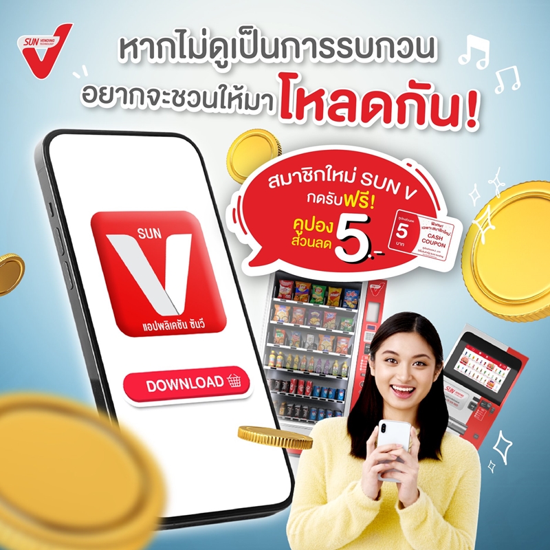 โหลดปุ๊บ รับปั๊บ คูปองเงินสดมูลค่า 5 บาท 💰 ใช้เป็นส่วนลดสินค้าได้ทุกชิ้นตั้งแต่ราคา 12.- ขึ้นไป ที่ตู้ SUN Vending