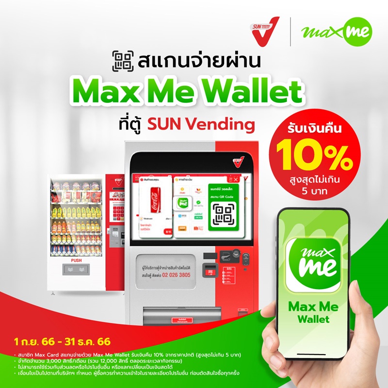 - สแกนจ่ายผ่าน Max Me Wallet รับเงินคืนทันที 10% จากราคาปกติ (สูงสุดไม่เกิน 5 บาท) ใช้ได้กับสินค้าที่ตู้ Sun Vending